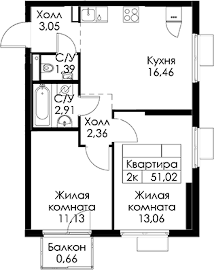 Двухкомнатная квартира на 5-ом этаже 51,02 кв.м